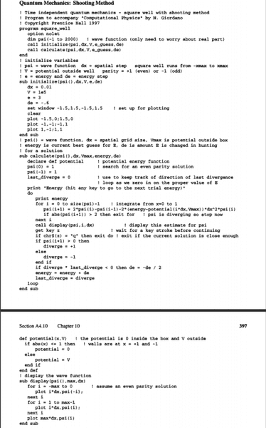 Hello! I am trying to write a program that solves the Schrödinger Equation for a particle in an infinite square well. I did a lot of research regarding the methods that could be used to accomplish this. I am writing this program in Matlab. The method I am using is called the Shooting Method. In my code below, when I plot psi vs. x_negative, I do not get a wave function that looks like what we expect. I am not sure where I am going wrong with this. I also don't know how much details I should include in this thread. Please, ask me for more information if needed. I have also attached picture of the textbook I am using for my logic. It is from the Computational Physics textbook by N. Giordano. Thank you very much for your help!