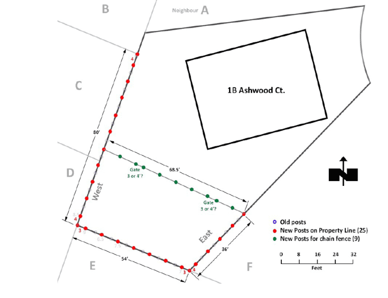 I am dividing my backyard in half, one area will be fully enclosed by a 6+ ft fence, in anticipation of a pool. Three sides of the enclosed area are on the property line (red posts) and will be enclosed in a standard wooden privacy fence (shared with neighbours). The yard itself will be divided by an interior fence (green posts) so that we have a play area (in anticipation of a pool).