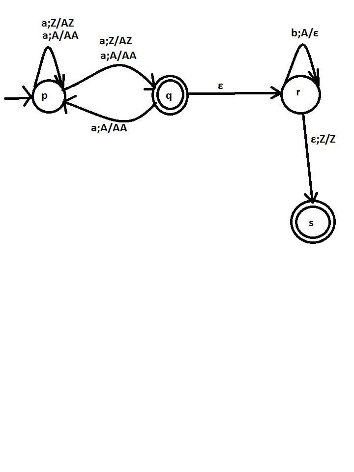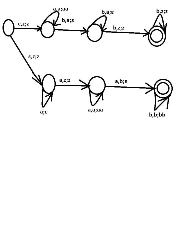 The PDA correctly accepts $a^nb^nb^+$ in the upper branch.