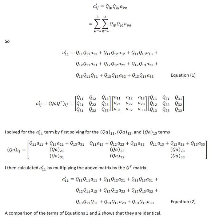 Per strangerrep's post from Yesterday at 1:55PM, this "turns into ##a^{'}_{ij}=Q_{ip}a_{pq}Q_{jq}##..." (Eq 2)
