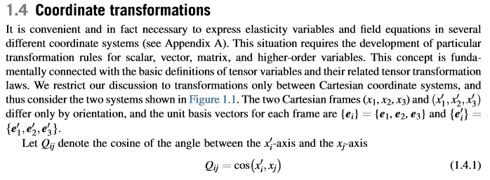 My apologies! The book defines ##Q_{ij}## as the cosine of the angle between the ##x^{'}_{i}## and ##x_j## axes. See attachment.