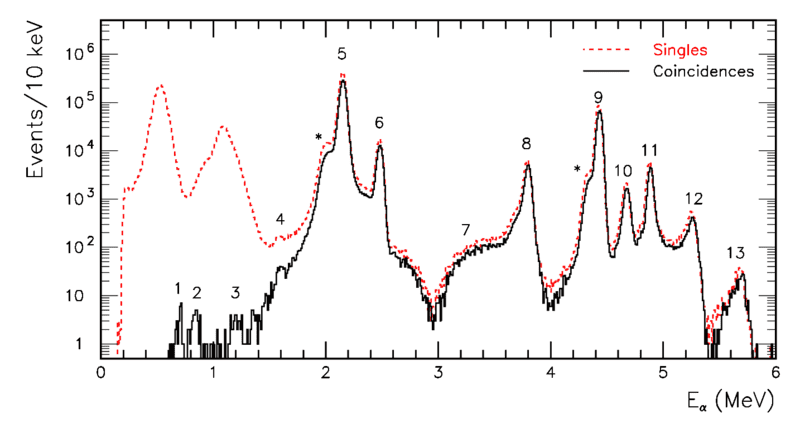 The experimental spectrum of ##{}^{20}Na## can be found below. Apart from peaks that may be fitted with Breit-Wigner type expression like in equation (20.77) there is an interesting minimum close to ##3 \mathrm{MeV}## alpha particle energy. One possible interpretation is that it is due to interference between the strong peak (named 5) just below ##2.2 \mathrm{MeV}## and a quite broad level (named 7) somewhat above ##3 \mathrm{MeV}##. Can you devise an expression that could describe this? [Hint: the rewriting in terms of amplitudes in equation (20.76) will be a better starting point..]