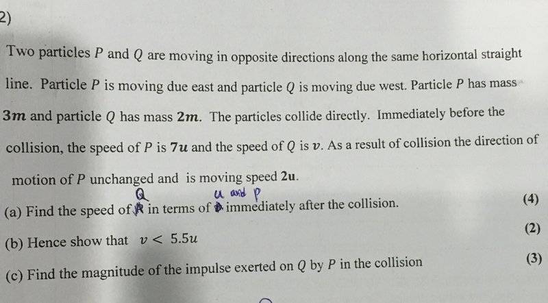 Two particles P and Q are moving in opposite directions along the same horizontal straight ine. Particle P is moving due east and particle Q is moving due west. Particle P has mass 3m and particle Q has mass 2m. The particles collide directly. Immediately before the collision, the speed of P is 7u and the speed of Q is v. As a result of collision the direction of motion of P unchanged and is moving speed 2u.