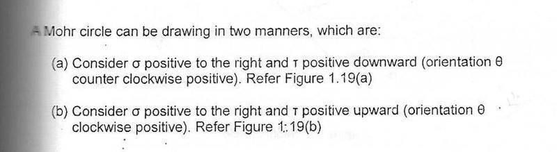 The discussion focuses on the sign convention used in Mohr's Circle for stress analysis. Participants confirm that in Mohr's Circle, normal stress (σ) is considered positive when acting to the right, while shear stress (τ) is positive when acting downward. Additionally, the clockwise orientation for angles (θ) is accepted as positive, contrasting with the traditional counterclockwise convention. This clarification is essential for accurately interpreting stress states in engineering applications.
