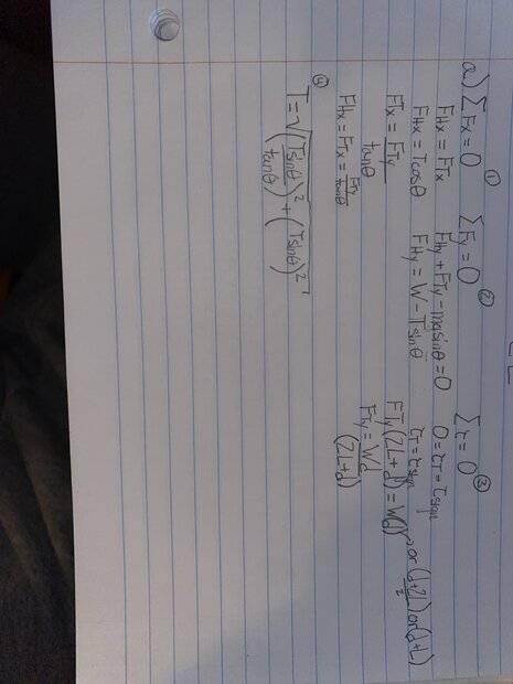 Attempted creating equations for zeros of torque and components of forces in x and y as seen in picture. Got lost with having only variables and the d & 2L for the length of the beam. Not sure how to do the question with two points of contact between the beam and the sign. Is the center center of mass changed because of that and/or what's the distance I use for that part?