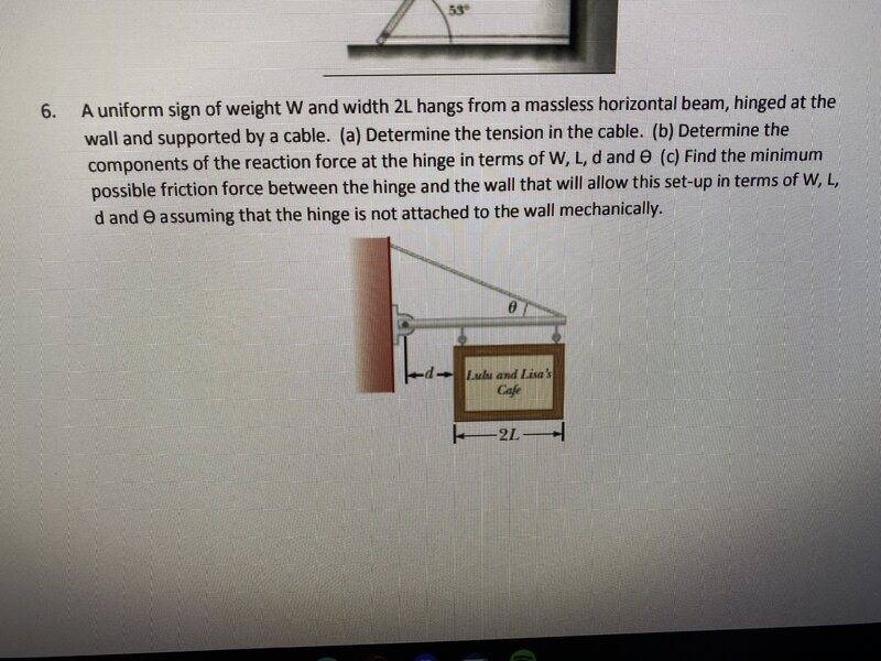 - A uniform sign of weight W and width 2L hangs from a massless horizontal beam, hinged at the