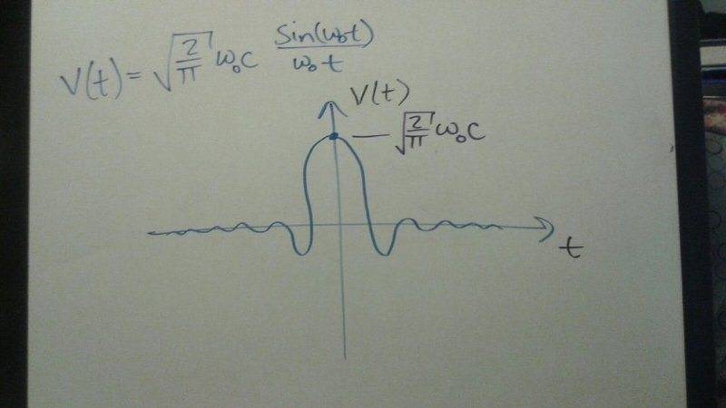 V(t) = 2C/√(2π) * sin(ω0t)/t = √(2/π)*ω0C * sin(ω0t)/ω0t