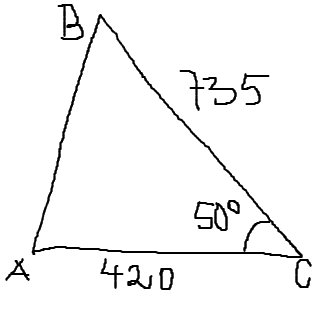 We have a right triangle with sides of length 735 and 420 m where the intermediate angle of aforementioned sides is 50°. The task is simple: Calculate |AB|. Here is a picture: