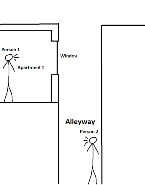 There are two blocks of apartments separated by a narrow alleyway. Person 1 is in the middle of the room in Apartment 1 (first floor if you are in the UK and second floor if you are in the USA!) and Person 2 is on the ground outdoors in the alleyway.
