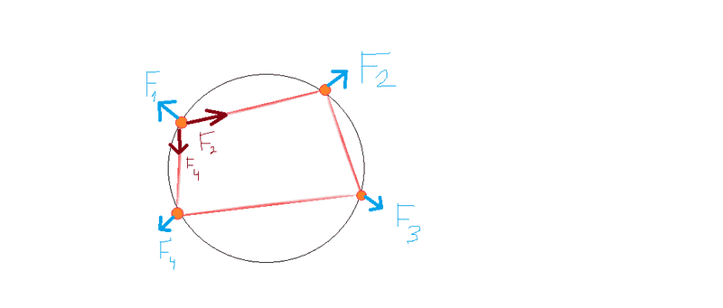 The discussion revolves around a mechanics problem involving a system of four points connected by ropes along a circle of radius R, with forces applied to each point. The original poster seeks to determine the resulting force in the system and questions the validity of summing the forces as vectors.