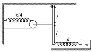 In the given figure, all the springs and pulley are ideal and surface is frictionless. The rod is massless. The time period of horizontal oscillations of the block is?