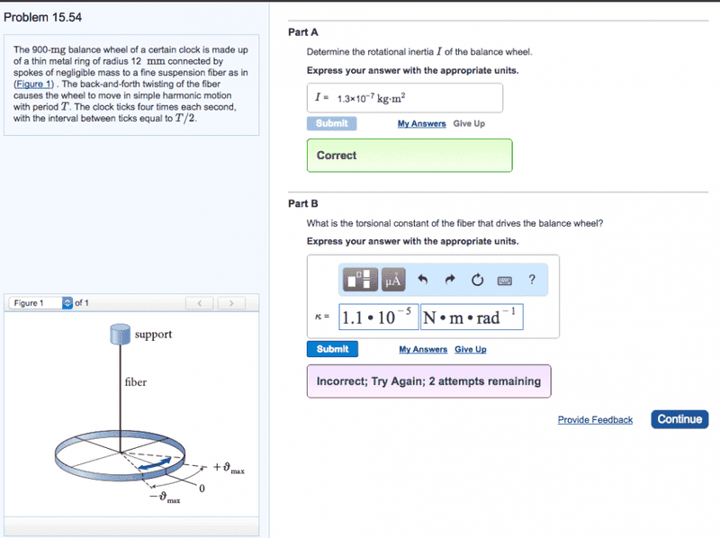 The 900-mg balance wheel of a certain clock is made up of a thin metal ring of radius 12 mm connected by spokes of negligible mass to a fine suspension fiber as in (Figure 1) . The back-and-forth twisting of the fiber causes the wheel to move in simple harmonic motion with period T. The clock ticks four times each second, with the interval between ticks equal to T/2.