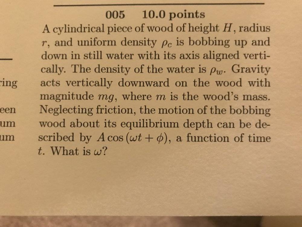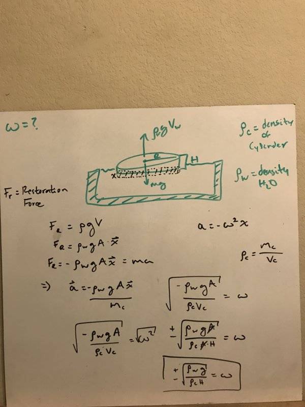 The discussion revolves around determining the angular frequency (omega) of a cylindrical object floating on water that undergoes simple harmonic motion as it moves up and down. Participants explore the relationship between the forces acting on the object and the equations of motion governing its oscillation.