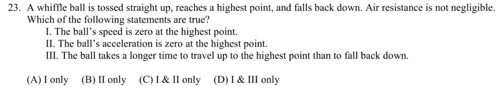 The discussion centers on a kinematics multiple-choice question regarding the motion of a ball influenced solely by gravity, with a specific focus on the acceleration due to gravity at -9.8 m/s². The participant selected option A, believing that gravity was the only force acting on the ball, while the correct answer was identified as option C. Key points include the clarification that air resistance is negligible at the highest point of the ball's trajectory, allowing gravity to be the sole force acting on the ball at that moment.