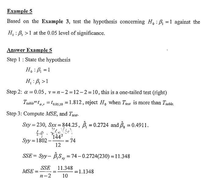 I think for the second question is wrong . It's clear that in example 3 the B_1 is 0.2724 , which is not 1 . So , i think we should reject H0 , so that the slope , B_1 not equal to 1 . Correct me if i am wrong . [/B]