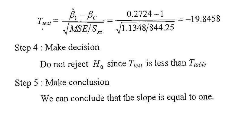 Second question , it's clear that in the 2nd photo , the slope , B_1 is 0.2724. It's is to test whether the slope equal to 1 in example 5 .. Why at the end of result , we should do not reject H0 , and conclude that B_1 is 1 ?