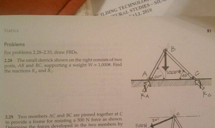My equation for Fv is sin 60 (AB) + sin 45 (BC) – 1000 = 0