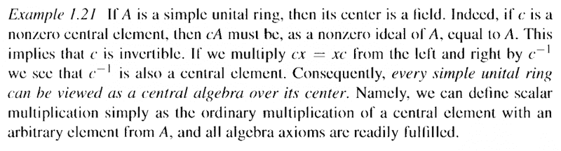 " ... ... Indeed, if ##c## is a nonzero central element, then ##cA## must be, as a nonzero idea of ##A##, equal to ##A##. This implies that ##c## is invertible. ... ... "Can someone please show me exactly why it is the case that ##cA## being equal to ##A## implies that ##c## is invertible ...Help will be appreciated ...