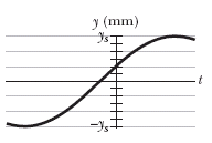 The figure shows the displacement y versus time t of the point on a string at x = 0, as a wave passes through that point. The scale of the x axis is set by ys = 84.0 mm.The wave has form y(x, t) = ym sin (kx - ωt+φ). What is φ? (Caution: A calculator does not always give the proper inverse trig function, so check your answer by substituting it and an assumed value of ω into y(x, t) and then plotting the function.)