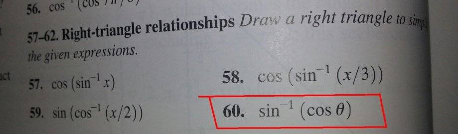 - Another participant mentions the identity $$\sin^2\theta+\cos^2\theta=1$$ as relevant for simplifying $$\sin(\cos^{-1}(x))$$, but not for $$\sin^{-1}(\cos(x))$$.