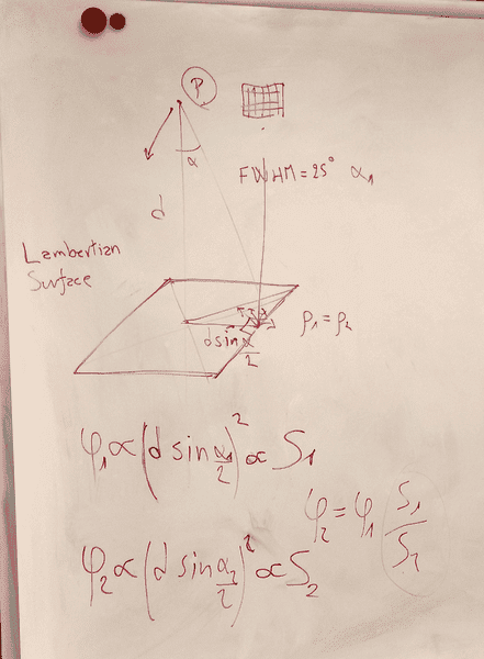 -and my final question is to the brief introduction that my professor gave me, where I made a picture of a formula which I did not really understand(I appended it as a picture). I know that the formulas are about two different lenses, with different FoV. But what exactly is calculated there? If it is the observed surface area of the different FoVs, shouldn't it be ## \varphi \propto (d * tan(\frac{\alpha}{2})*2)^2 ##, when d is the distance to the object and ## \alpha ## is the Field of View