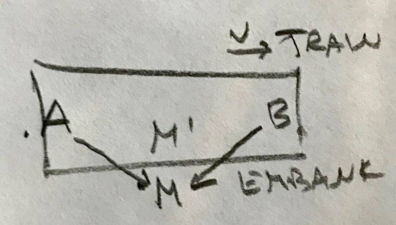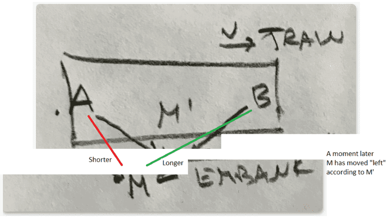 Now, the train approaches. Clock T reaches clock P1. You don't actually need any "observers" here, so I'm simply going to describe what the clocks read when they pass each other. This could be observed or recorded but it doesn't matter, The physics is the same.