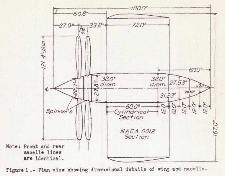 "Both the eight-blade single- and dual-rotating propellers were mounted in four-way hubs spaced 9 15/16 inches apart, thereby providing identical blade shank and spinner conditions. Preliminary tests were made to determine the optimum angular displacement between the front and rear propeller blades for the single-rotation test; the blades of the front propeller were set to lead the blades of the rear-propeller by 75°, 52.5° and 30°. Although the results indicated little difference between these three spacings, the 52.5° spacing was considered the best. Equal spacing of 45° was not possible owing to a limitation imposed by the shaft spline."
