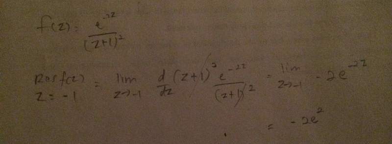 $$Resf(z)_{|z=-1|}=\lim_{{z}\to{-1}}\frac{d}{dz}((z+1)^2\frac{e^{-2z}}{(z+1)^2})$$
