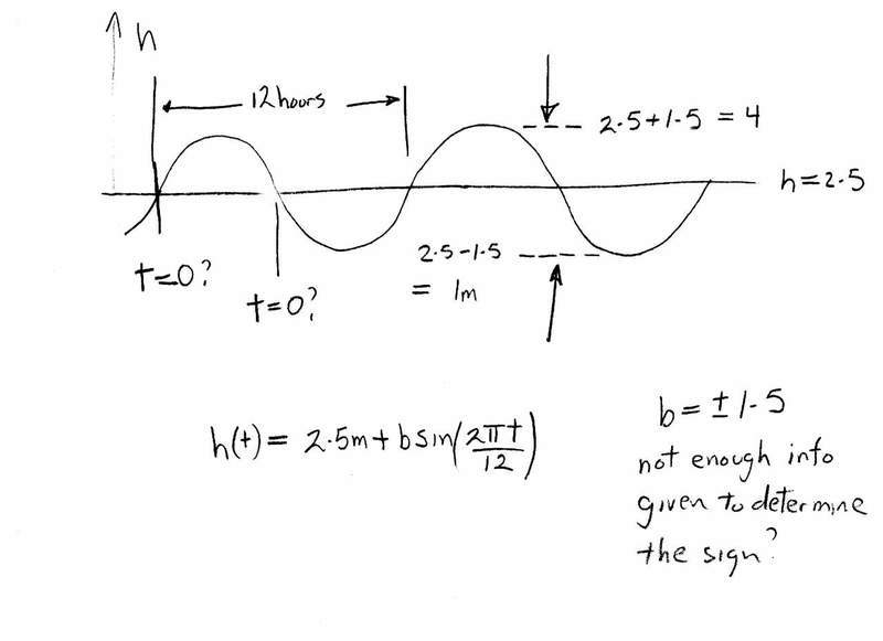 Measurements of the height h(t) of water in a harbor are recorded ,where h is measured in meters and t in hours.It was noted that the rise and fall of a tide is modeled by a sinusoidal function giving the height by : h(t)=a+bsin(kt+c).