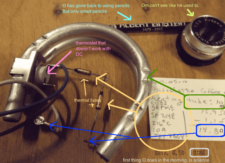 Anyways, the capacity is 10 ml, and the element has a resistance of 14.8 Ω. (same as my current drip coffee maker)