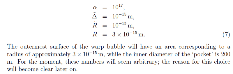 - One participant questions the understanding of the warp bubble's dimensions, specifically the area corresponding to a radius of approximately 3×10−15 m and the inner diameter of 200 m.