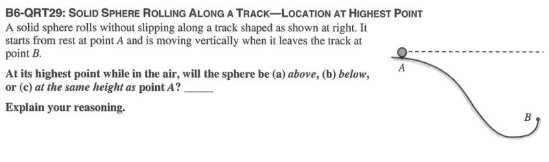 I don't have an answer key provided, but I'd really like to verify that I'm right (or if I'm wrong, why). I think ti'd be (c) because assuming that due to inertia, B will continue going straight up (even though gravity will decelerate its motion). When it finally stops moving, it will have 0 KE, but assuming the energy is conserved, it should have the same amount of mechanical energy as it did in A. Since at A, the ball had only gravitational potential energy (mgh), at its highest point in air, it too should have mgh and thus the same height as point A.
