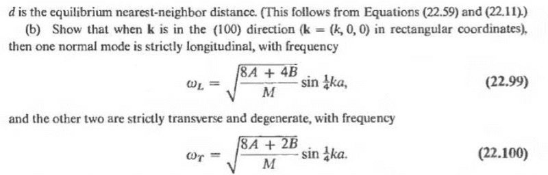 My question is more about the math of the problem. For equation 22.97, how do I construct a 3x3 matrix from a 12 element series? After constructing the matrix should I set the determinant equal to 0 where I will find the determinant has 3 solutions (2 being degenerate)? Also, under 22.98, what does "1 is the unit matrix ((1)uv=diracdelta_uv), and RR is the diadic formed from the unit vectors R=R/R..." mean?