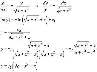 ln y = { integral ( - ( dx / ( sqrt(a+(x^2)) ) ) ) } + ln c