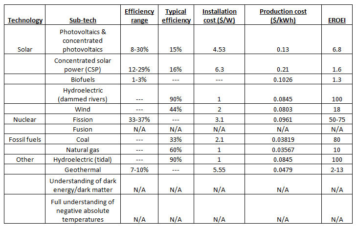 Below is a table including an overview of all the main technologies groups like the NREL are looking at. I did leave out one of the most obvious solutions, which is conservation of energy (as I feel this is kind of goes without saying that there are ways we could cut the usage of energy in several areas.)