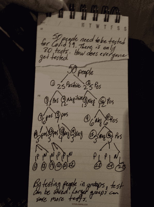 The discussion centers on the feasibility of sharing Covid-19 spit tests among groups, such as families or departments, to reduce the number of tests required. Participants highlight that while theoretically, pooling samples could minimize testing from N to log2 N, practical issues arise, including sample dilution and increased error rates. The current testing methods, including antigen and antibody tests, require specific procedures that complicate the pooling approach. Ultimately, the consensus is that while the idea is mathematically intriguing, it is not practical for real-world application due to the complexities involved.