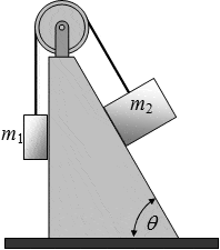 A massless string, passing over the frictionless pulley, connects the two masses as shown. Block m1 hangs vertically without touching the wall, but m2 slides along the wall with friction (μs = 0.61, and μk = 0.14). If θ = 53°, how many times heavier than block 1 must block 2 be to start the system moving?
