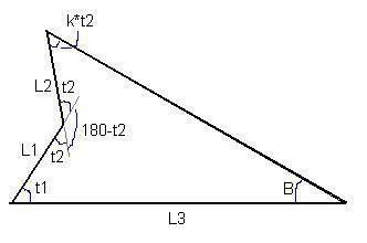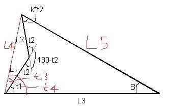 I have this arrow head geometry question (Please see diagram). I know L1, L2 and L3, angle B and the constant k (notice how the corner angle is equal to k * t2). I don't know t1 and t2. I'm pretty sure I have enough constraints, I'm just having trouble finding the right ones to use. Note that the arrow head is not symmetric so the top edge length is not equal to L3.