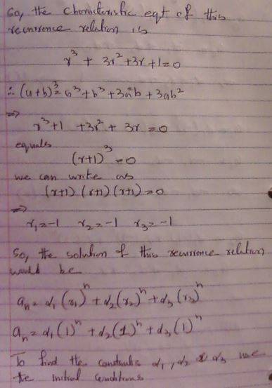 The discussion revolves around solving for constant coefficients in a recurrence relation involving characteristic roots, specifically focusing on a root of multiplicity 3. Participants seek clarification on the derivation of the closed-form solution and the correct notation for mathematical expressions.