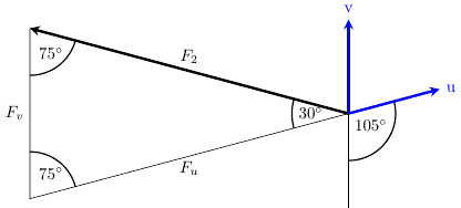 I correctly calculated 150cos(150)N or 130N as the positive magnitude for F2 along the U axis however I cannot figure out what it is along the V axis.
