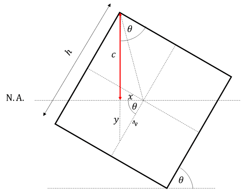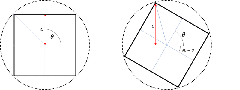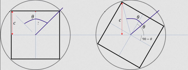 The discussion revolves around solving for the variable ##c## in the context of a rotated square, specifically focusing on the geometric relationships and equations that arise from the rotation. Participants explore various mathematical approaches and equations related to the problem, including the implications of different angles of rotation.