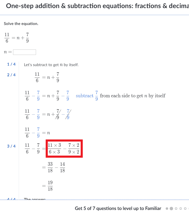 This discussion focuses on the process of expanding fractions to achieve a common denominator for subtraction. The fractions involved are $\frac{11}{6}$ and $\frac{7}{9}$, with denominators of $6$ and $9$, respectively. The Least Common Multiple (LCM) of these denominators is $18$. The first fraction is expanded by multiplying by $3$, resulting in $\frac{33}{18}$, while the second fraction is expanded by multiplying by $2$, resulting in $\frac{14}{18}$. This allows for the subtraction to be performed as $\frac{11}{6} - \frac{7}{9} = \frac{19}{18}$.