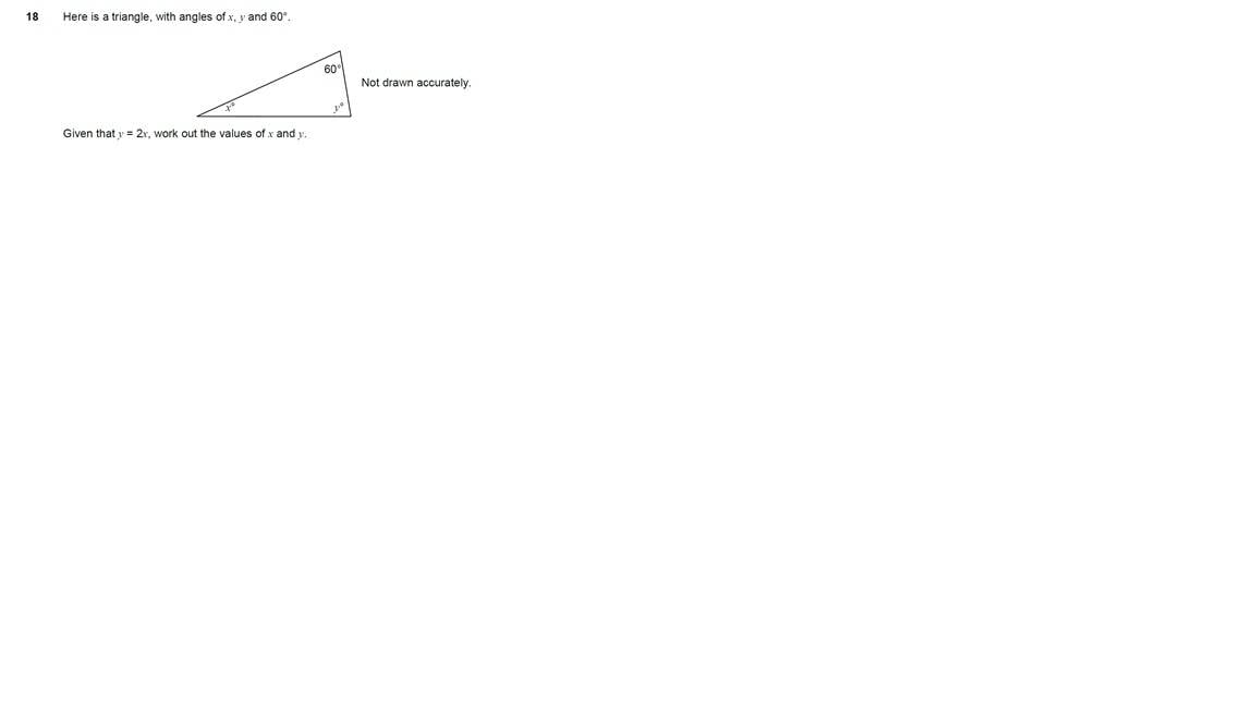 x=30 and y (2x) = 60. I've come to this as I think it's an isosceles triangle so the base angles would be equal. Am I right?