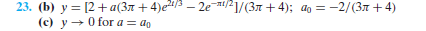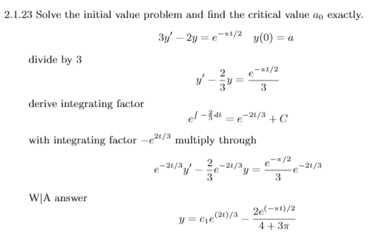 The discussion focuses on solving the initial value problem (IVP) from the 2000 exam, specifically problem #23, which involves the differential equation $e^{-2t/3} y' - \dfrac{2e^{-2t/3}}{3} y = \dfrac{1}{3}e^{-(3\pi+4)t/6}$. The solution process includes applying the integrating factor method, resulting in the general solution $y = Ce^{2t/3} -\dfrac{2}{3\pi+4}e^{-\pi t/2}$. The discussion highlights the importance of correctly applying initial conditions, such as $y(0)=A$, to derive specific solutions.