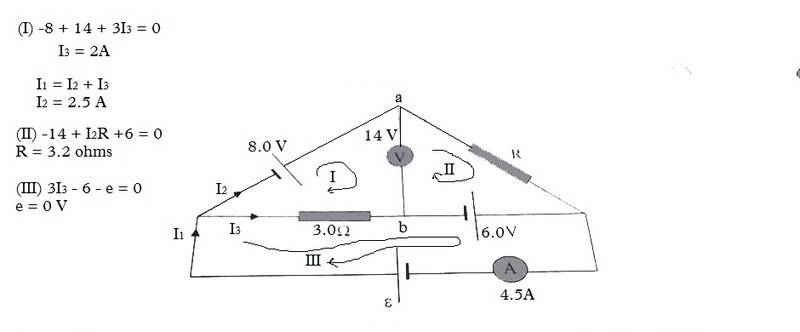 The discussion centers on solving Kirchhoff's Voltage Law (KVL) for a circuit with a resistance (R) of 3.2 Ohms and an electromotive force (e) of 0 Volts. The participant confirmed the resistance value but expressed confusion regarding the zero voltage. The analysis included assumptions of infinite resistance for the voltmeter and zero resistance for the ammeter, which are critical for accurate circuit analysis.