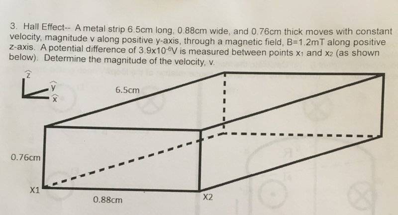 A metal strip 6.5cm long, 0.88cm wide, and 0.76cm thick moves with constant velocity, magnitude v along positive y-axis, through a magnetic field, B=1.2mT along positive z-axis. A potential difference of 3.9x10^-6V is measured between points x1 and x2 (as shown in halleffect.jpg). Determine the magnitude of the velocity, v.