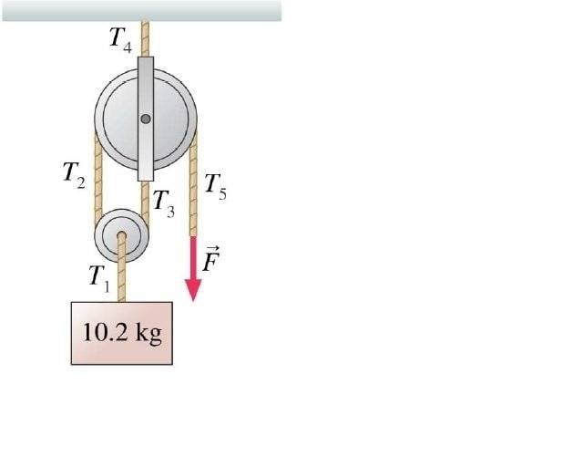 Q: A 10.2 Kg block is held in place by a massless rope passing over two massless, frictionless pulleys. Find the tensions T1, T2, T3, T4, T5 and the magitude of force F. Please see attached file for picture.