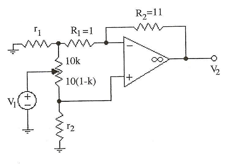 The discussion focuses on solving an op-amp circuit problem involving a potentiometer that adjusts gain between -10 and +10. The relationship for V2/V1 is established as V2/V1 = {r1/(r1+10k)} [-11/{1+(10kr1/r1+10k)}] + [r2/r2+10(1-k)] [1+ {11/1+10kr1/r1+10k}]. The user seeks guidance on writing nodal equations for the potentiometer, which can be conceptualized as two resistors in series with values of 10k and 10(1-k).