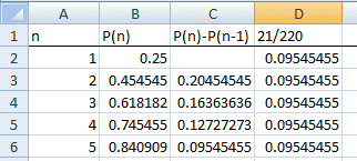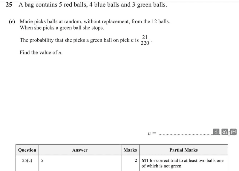 ##P_{green} = \dfrac{9}{12}×\dfrac{8}{11} ×\dfrac{7}{10}×\dfrac{6}{9}×\dfrac{3}{8} = \dfrac{21}{220}##