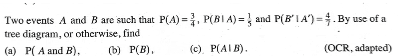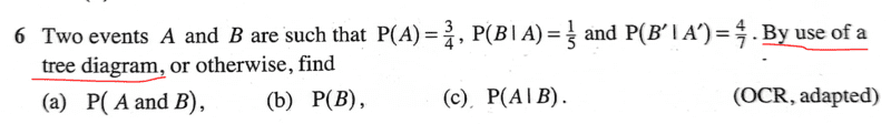 b. ## P(B/A')=\dfrac{P(B)-\dfrac{3}{20}}{P(A')}##